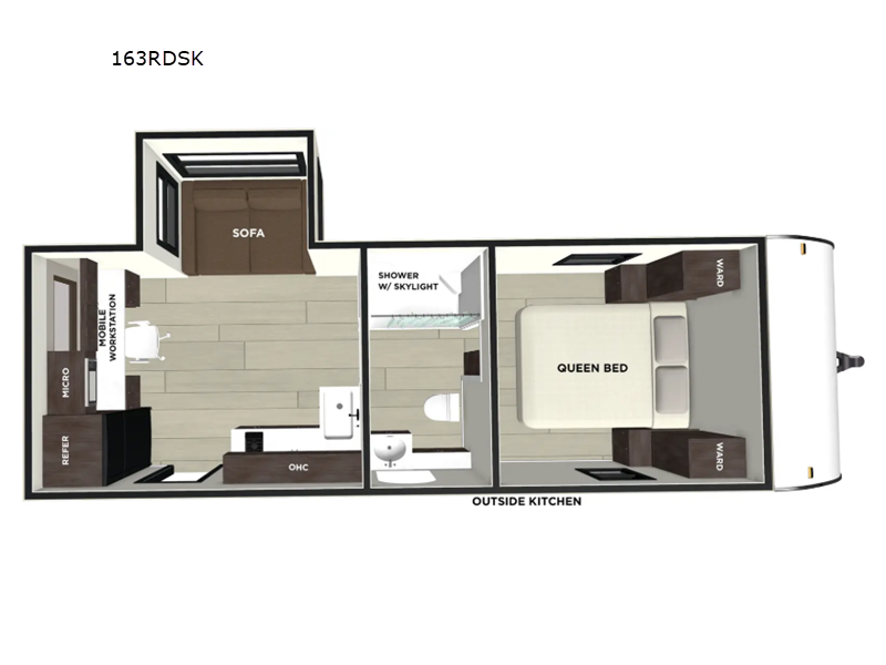 You're going to love every minute spent in this couple's trailer. The queen bed in the front private bedroom will provide a great night's rest, and there are dual wardrobes to easily get dressed in the morning. Head to the kitchen through the bath, then prepare eggs and bacon on the two burner cooktop. There is theater seating here to enjoy your coffee at each morning, or you may want to get some work done at the mobile workstation!
