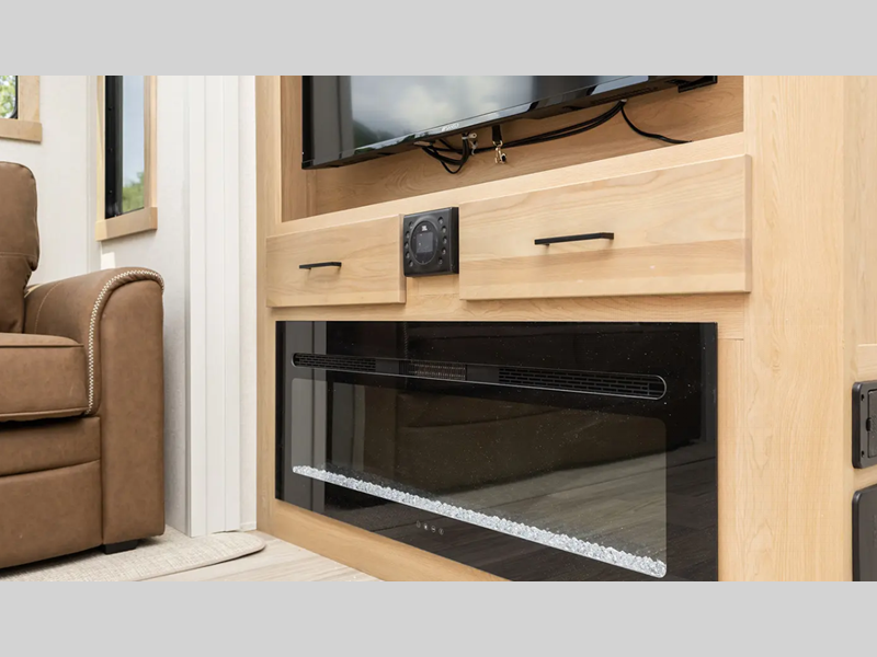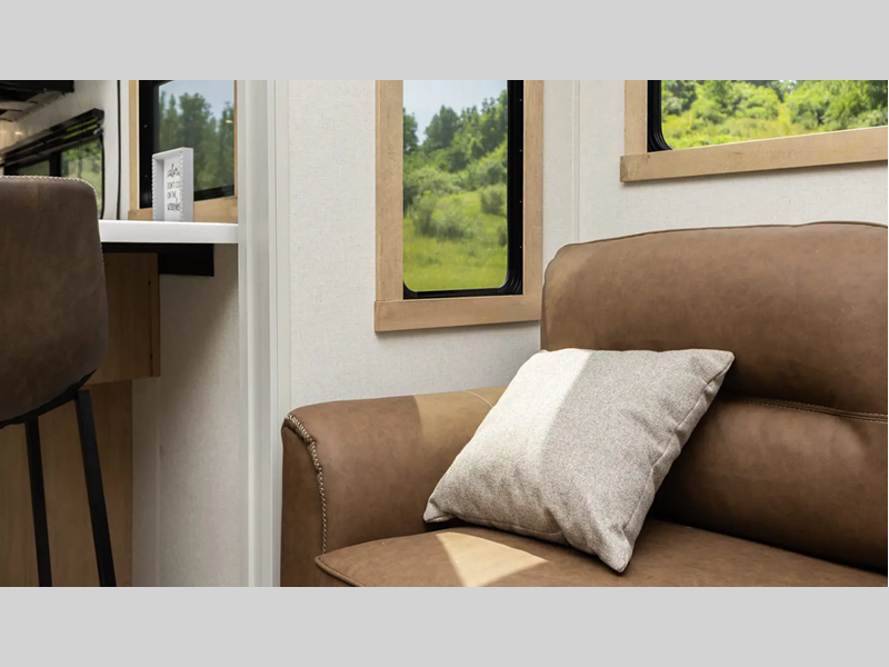 Each destination trailer features a painted full profile fiberglass front cap with a windshield, an underbelly armor, and Lippert auto adjust brakes for a smooth towing experience. Inside, you will love the solid surface kitchen countertops, residential stain resistant carpet, decorative backsplash, and many more comforts.