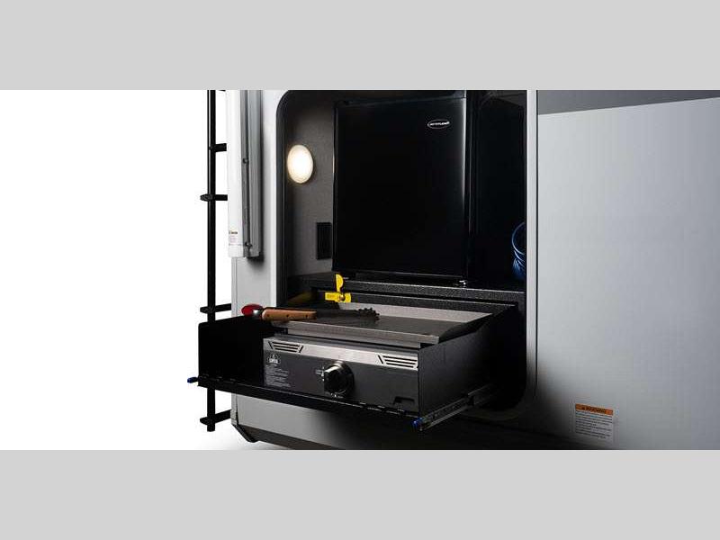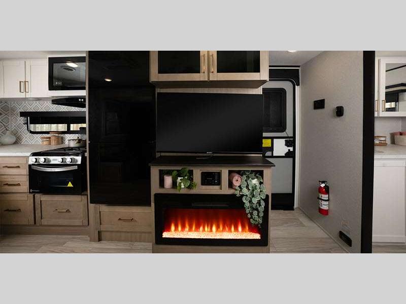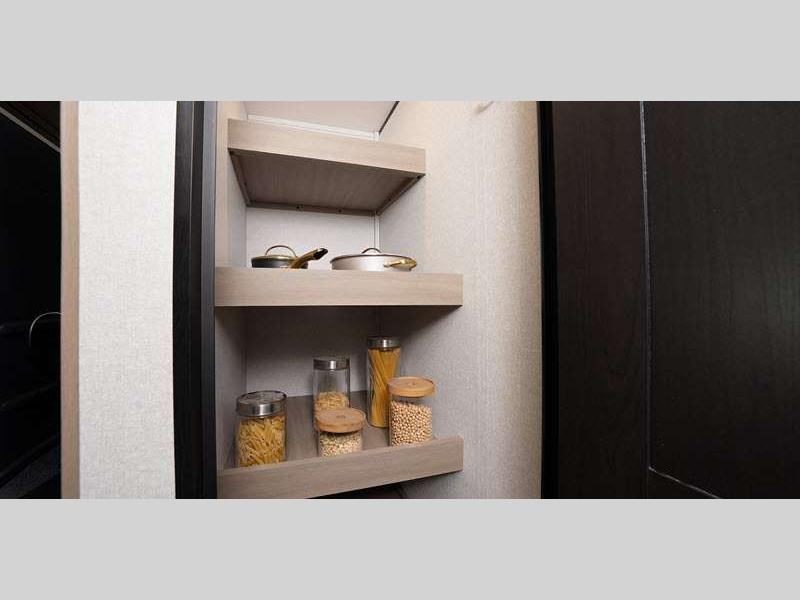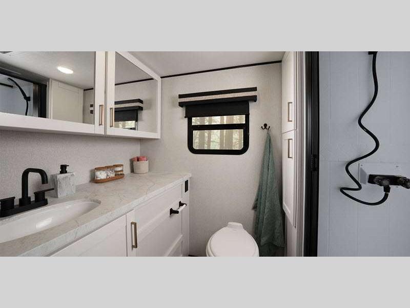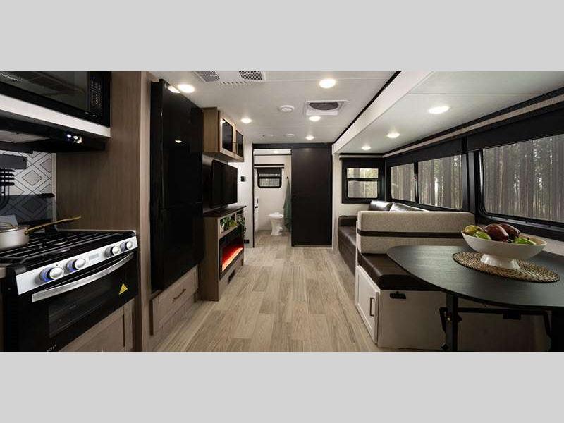 The power tongue jack and self-adjusting electric brakes make set-up a breeze so you can get to camping right away, and under mount spare tire, sewer hose storage compartment. Each model features automotive style aluminum rims. You will love the modern interior with stainless steel sink, seamless countertops throughout, and increased density foam for firmer dinette cushions.